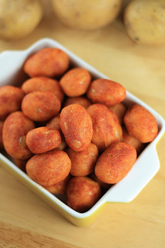3. U manjoj činiji pomešati pola kašičice soli, pola kašičice bibera i jednu kačišicu slatke tucane paprike. Kad se smesa prohladi toliko da se može pipnuti rukom, komadiće pirea rukama oblikovati u male nepravilne kuglice, veličine mladih krompirića, posipati po malo mešavinom soli, bibera i paprike, i redjati na tacnu za služenje. Do služenja čuvati na hladnom, pokriveno plastičnom folijom zbog sušenja.