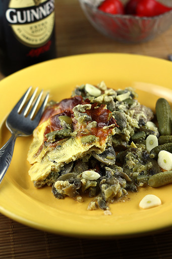 2. Use the oil the meat was fried on, add finely chopped onions and saute until onions are semi-soft adding some more oil or water if necessary. Stir in the finely sliced mushrooms, add diced pickles, mustard, spices and wine and cook.