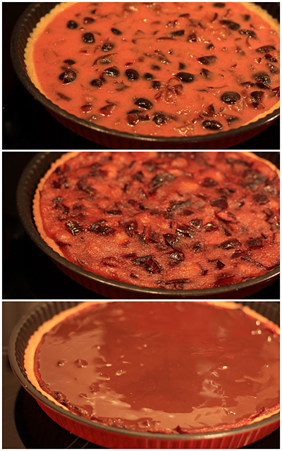 4. Prebaciti koru u pleh prečnika 25 cm i spustiti ivice, puštajući ih da budu deblje od testa na dnu. Sipati fil. Peći oko 40 minuta na 180°C. Fil treba da se ukuva i zgusne.